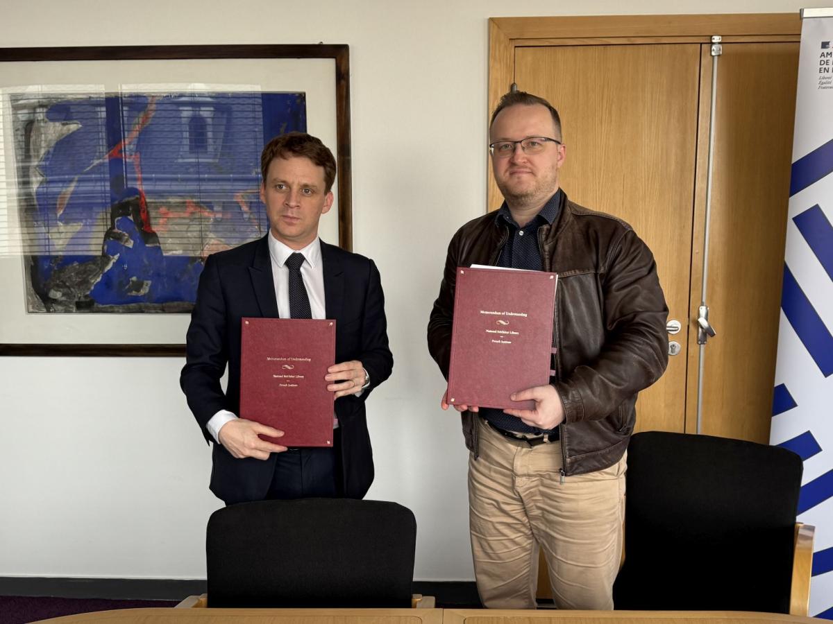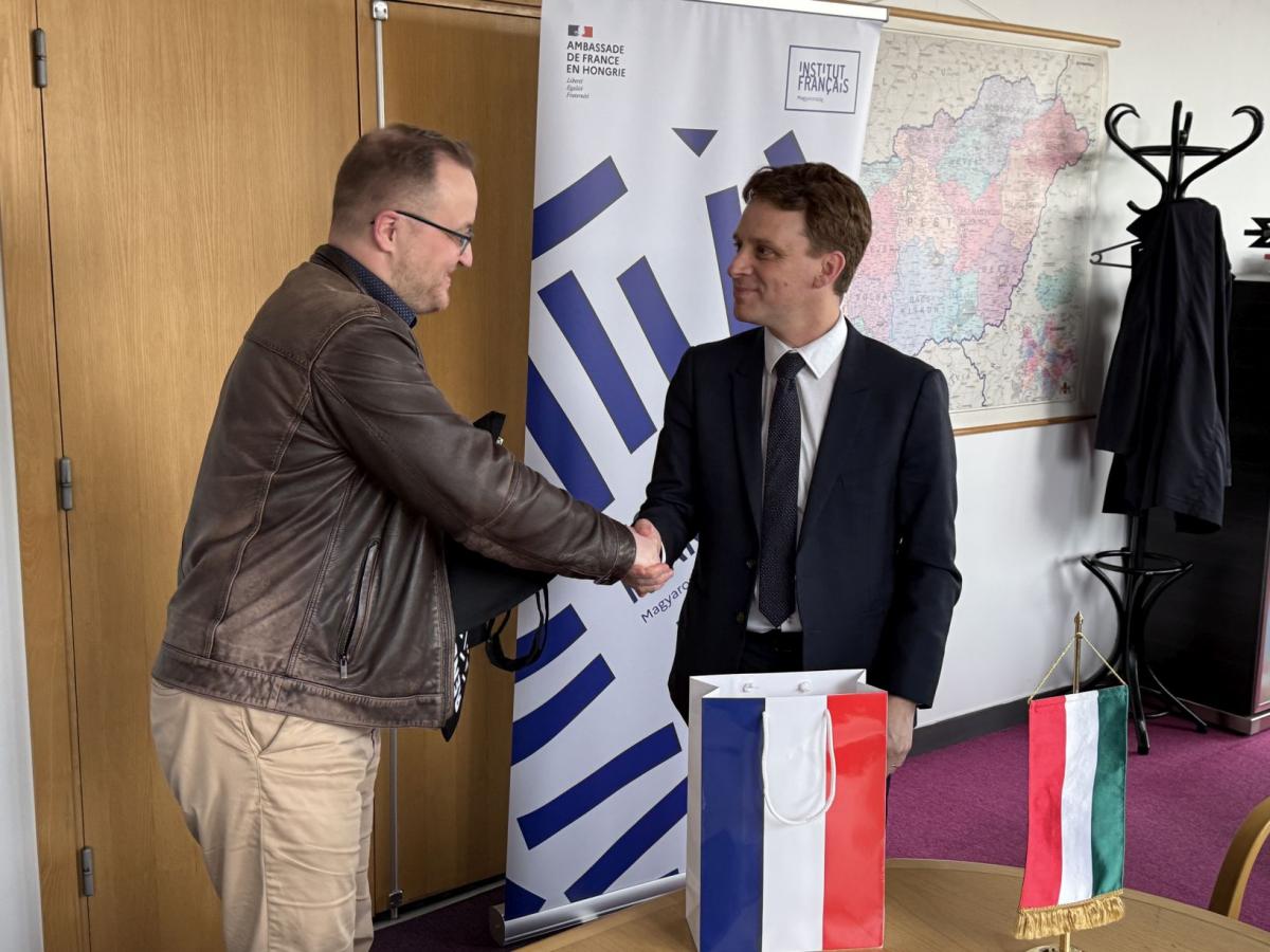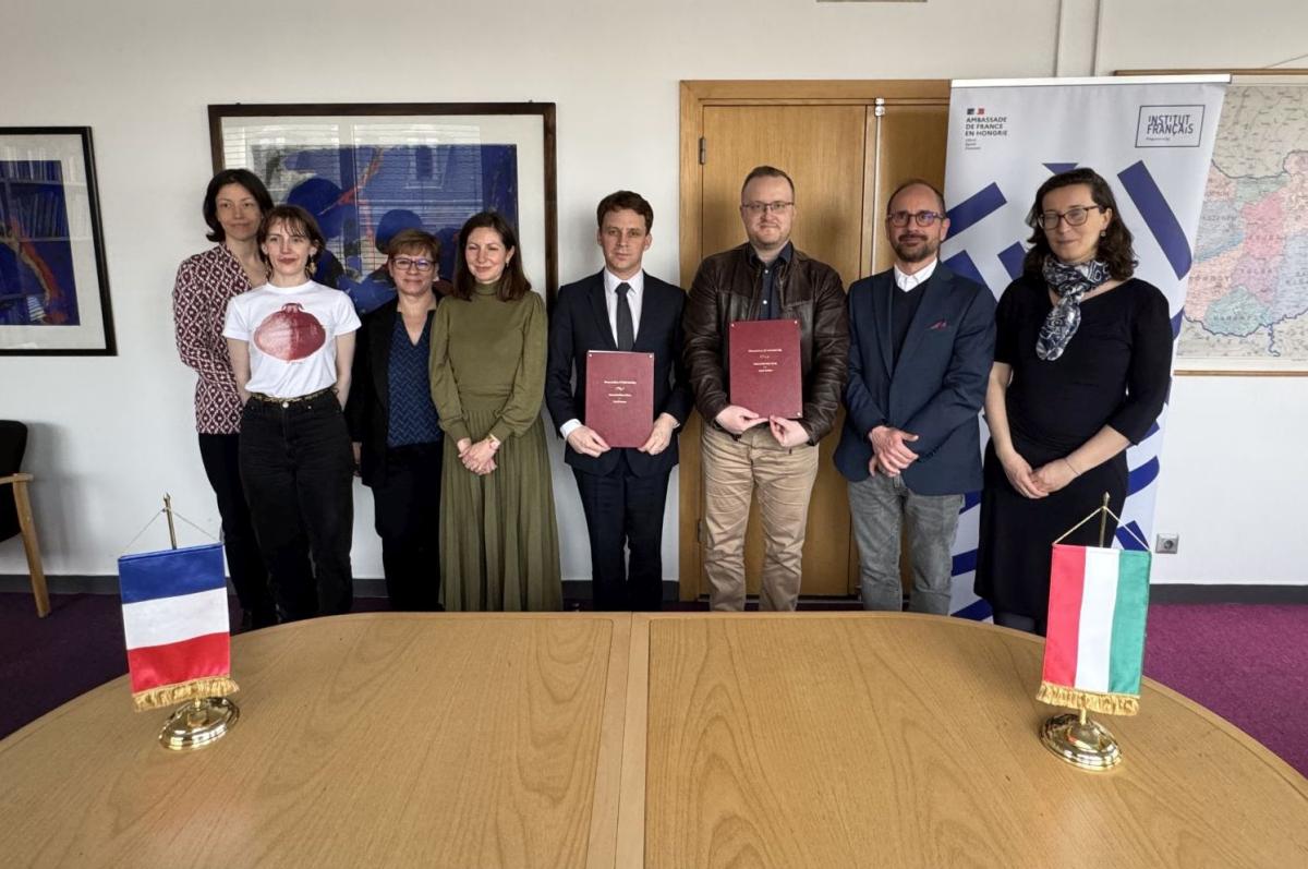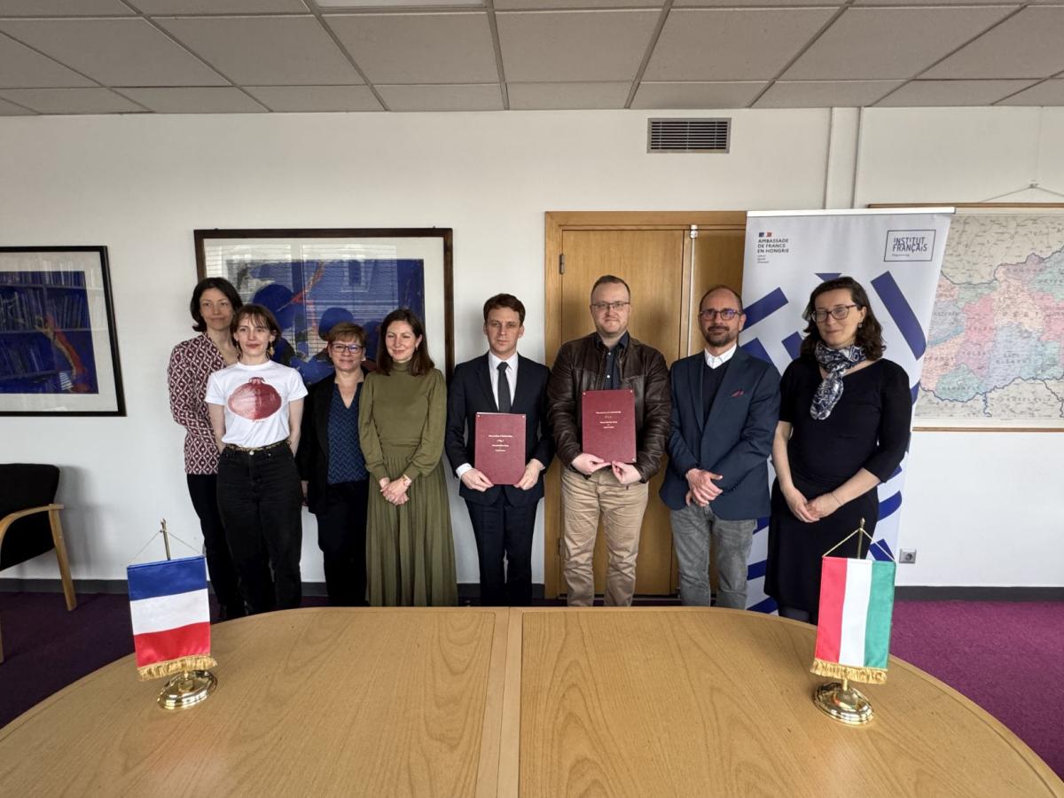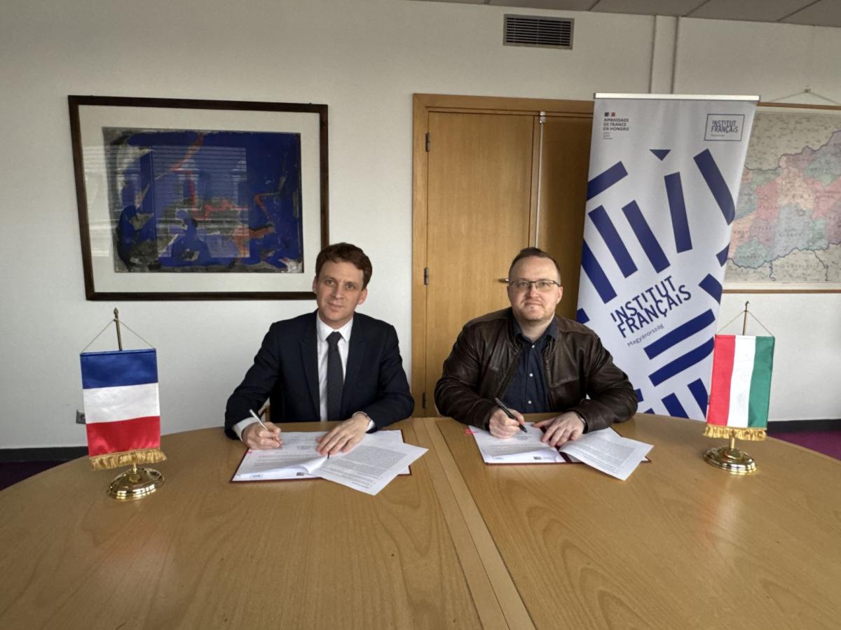 On 27 March 2026, the French Institute hosted an event at which Matthieu Berton, Director of the Institute, and Dávid Rózsa, Director General of the national library, ceremonially signed a cooperation agreement between the two institutions. The meeting was also attended by Zoltán Lewalt-Jezierski, Head of the Director General’s Cabinet at NSZL, and Sophie Sellier, Cultural Attaché.