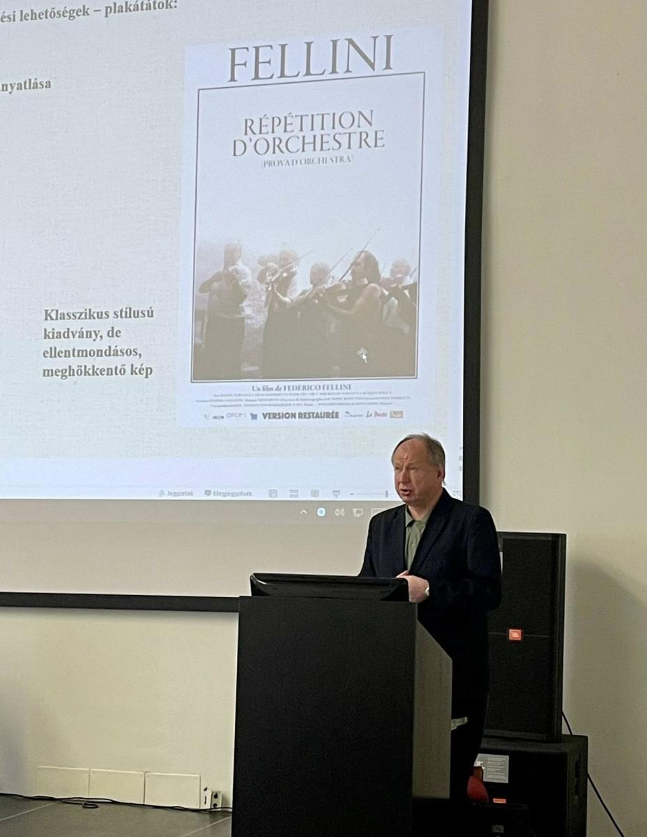Munkatársunk, Deák-Sárosi László filmesztéta, az MNMKK Országos Széchényi Könyvtár Történeti Fénykép- és Interjútárának munkatársa Cirkusz apokalipszis Federico Fellini Zenekari próba (1978) című filmjében címmel tartott előadást. Elemzésében a világhírű olasz rendező cirkuszi motívumait és bohócarchetípusait vizsgálta, rámutatva, hogy a film parabolikus történetében – egy lázadásba és tragédiába torkolló zenekari próba során – a nyugati kultúra hanyatlása és a közös művészet, mint a zenekari muzsikálás és a filmművészeti alkotás, szétesésének lényege jelenik meg. Deák-Sárosi értelmezése szerint Fellini alkotása a filmtörténeti modernizmushoz kapcsolódva önkritikus éllel boncolgatja a kultúra továbbélésének kérdéseit, miközben az 1968-as diáklázadások ellentmondásos örökségére is utal.