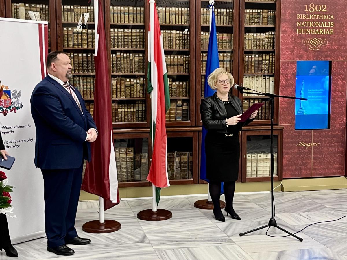 „Az év 18. napján” – ahogyan a programban szerepelt – Jurijsz Pogrebnyaksz nagykövet a Lett Köztársaság magyarországi nem rezidens katonai attaséjával, Erik Nagli ezredessel együtt köszöntötte a vendégeket az évforduló és a Lett könyv – 500 című kiállítás megnyitója alkalmából. Pogrebnyaksz nagykövet nyitóbeszédében hangsúlyozta: „November Lettország nemzeti ünnepének hónapja, amikor tisztelgünk Lettország szabadsága és népe előtt. Idén is különleges évfordulót ünneplünk, 500 éve, hogy megjelent az első lett nyelvű könyv. Nemcsak kultúránk alapköve, hanem nemzeti identitásunké is.”