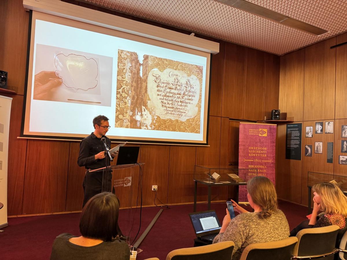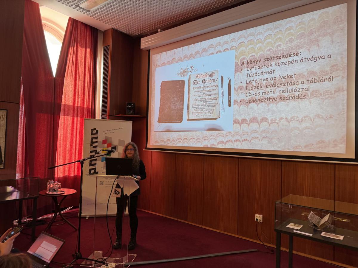 A program Farkas Vivien előadásával folytatódott. Az Állambiztonsági Szolgálatok Történeti Levéltárának állományvédelmi munkatársa a Papírba zárt áhítat – Raymundum Irregger Wissenschafft der heiligen című könyv restaurálásának kihívásait és megoldásait mutatta be. A szakmai nap záró előadását Bartha Veronika, a Hopp Ferenc Ázsiai Művészeti Múzeum állományvédelmi felelőse tartotta, aki egy XVI. századi biblia restaurálási munkálatairól számolt be.