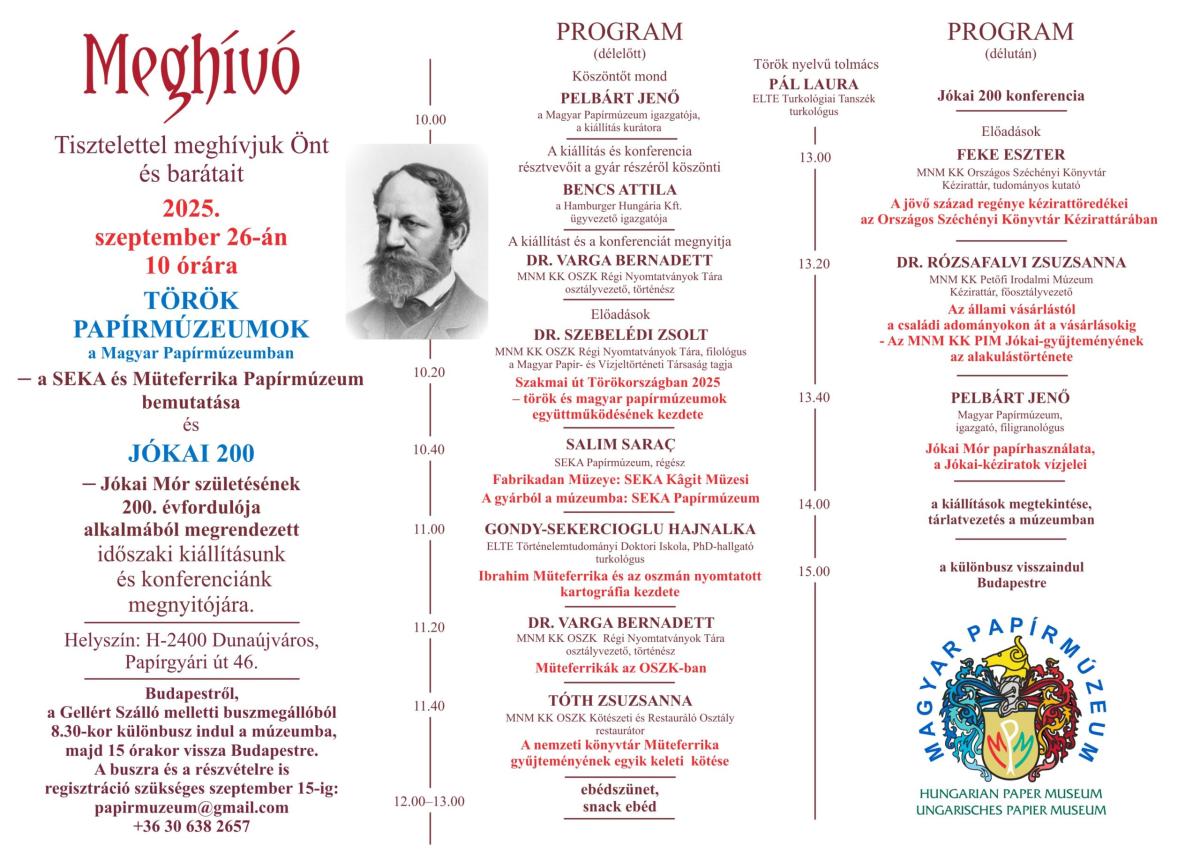 2025. szeptember 26-án a dunaújvárosi Magyar Papírmúzeumban konferenciát rendeztek, amelyet két tematikus egységre osztottak. A délelőtti program az akkor megnyíló Török papírmúzeumok a Magyar Papírmúzeumban című tárlathoz kapcsolódott, amelynek ötletét az adta, hogy a papírmúzeum munkatársai és támogatóik májusban Törökországba látogattak. Az izmiti SEKA Papírmúzeum és a yalovai İbrahim Müteferrika Papírmúzeum megtekintése során született megállapodás arról, hogy utóbbi testvérmúzeumává vált a Magyar Papírmúzeumnak, miközben a SEKA-val is szakmai együttműködés indult. A konferencia vendégei között így török előadó is szerepelt, a kommunikáció gördülékenységét pedig Pál Laura turkológus biztosította.