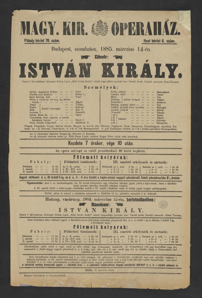 Az István király operaházi ősbemutatójának színlapja (Forrás: OSZK)