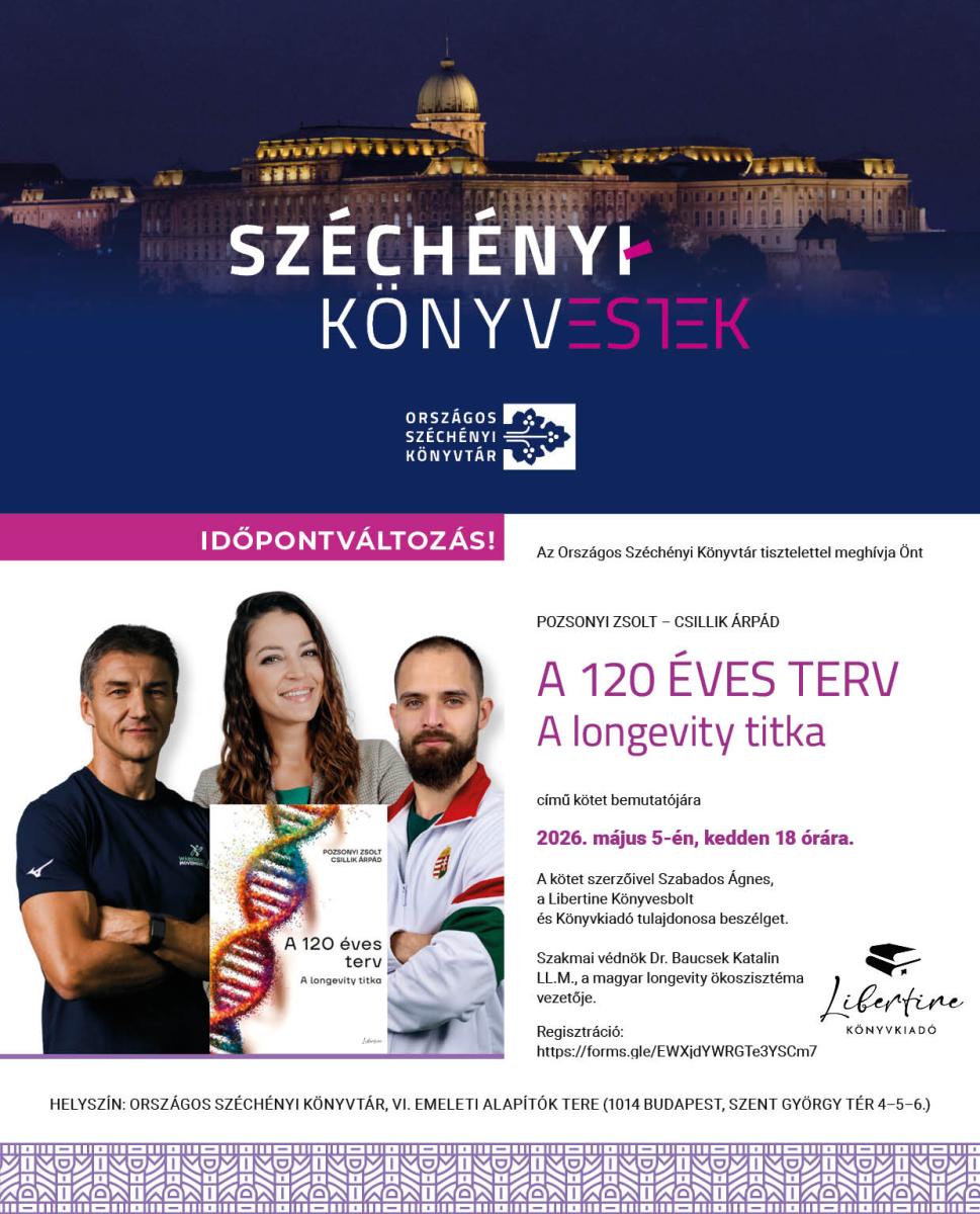 A Széchényi-könyvestek rendezvényén A 120 éves terv – A longevity titka című kötetet mutatjuk be. A szerzőpárossal, Pozsonyi Zsolttal és Csillik Árpáddal Szabados Ágnes, a Libertine Könyvesbolt és Könyvkiadó tulajdonosa beszélget. Az est szakmai védnöke dr. Baucsek Katalin LL.M., a magyar longevity-ökoszisztéma vezetője.