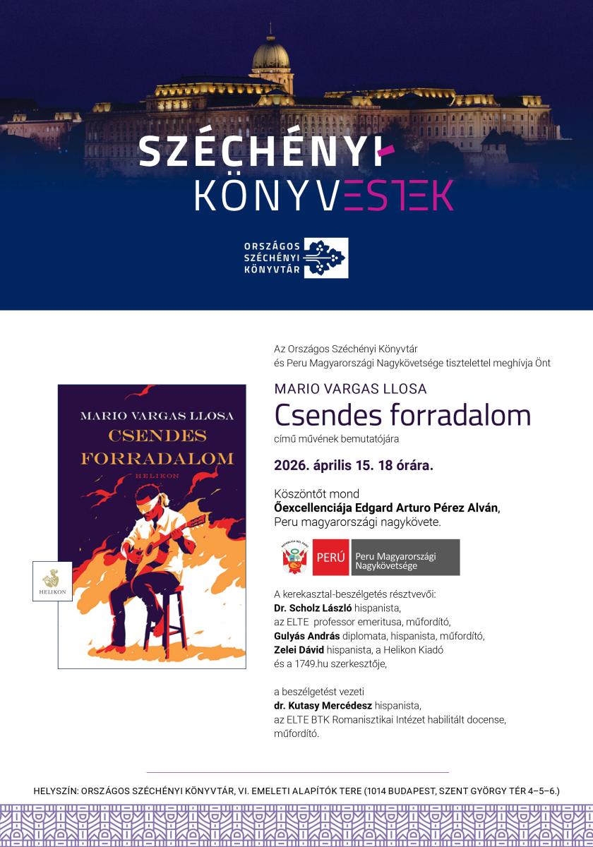 A Széchényi-könyvestek huszonharmadik rendezvényén Peru Magyarországi Nagykövetségével együttműködésben bemutatjuk a 2025 áprilisában elhunyt világhírű, Nobel-díjas író, Mario Vargas Llosa utolsó, Csendes forradalom című művét, amely a Helikon Kiadó gondozásában jelent meg magyarul. Az estünk mottójául választott idézet az író kedvenc dalának címe, egyszersmind a most bemutatandó mű kiindulópontja.