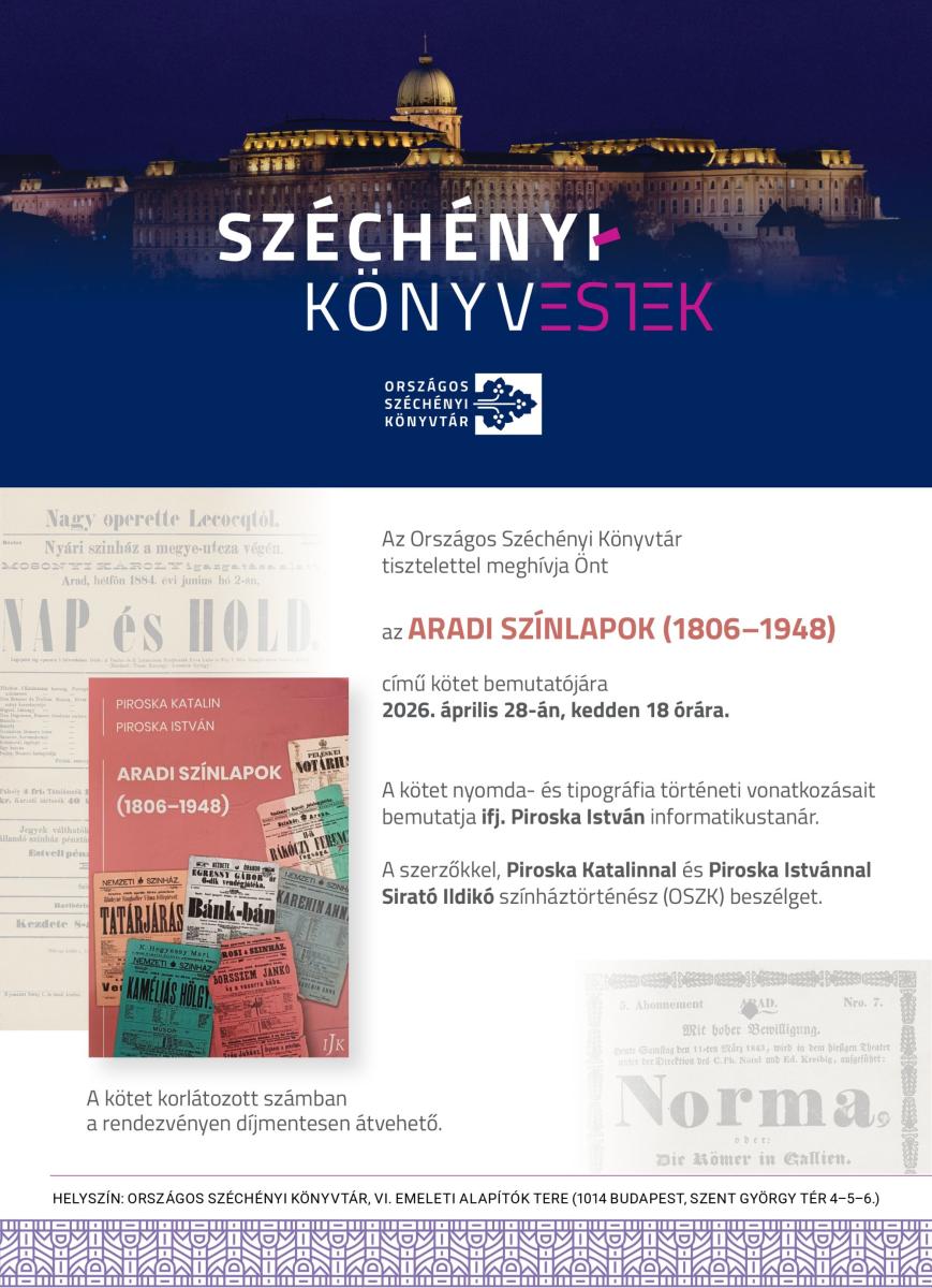 Könyves estünkön az aradi Irodalmi Jelen Könyvkiadó gondozásában és a Nemzeti Kulturális Alap támogatásával napvilágot látó kötet nyomda- és tipográfiatörténeti vonatkozásait ifj. Piroska István informatikustanár mutatja be. Ezt követően pedig Sirató Ildikó színháztörténész (OSZK) beszélget a szerzőpárossal, Piroska Katalinnal és Piroska Istvánnal az aradi színháztörténetet feldolgozó kutatásaikról és eredményeikről.